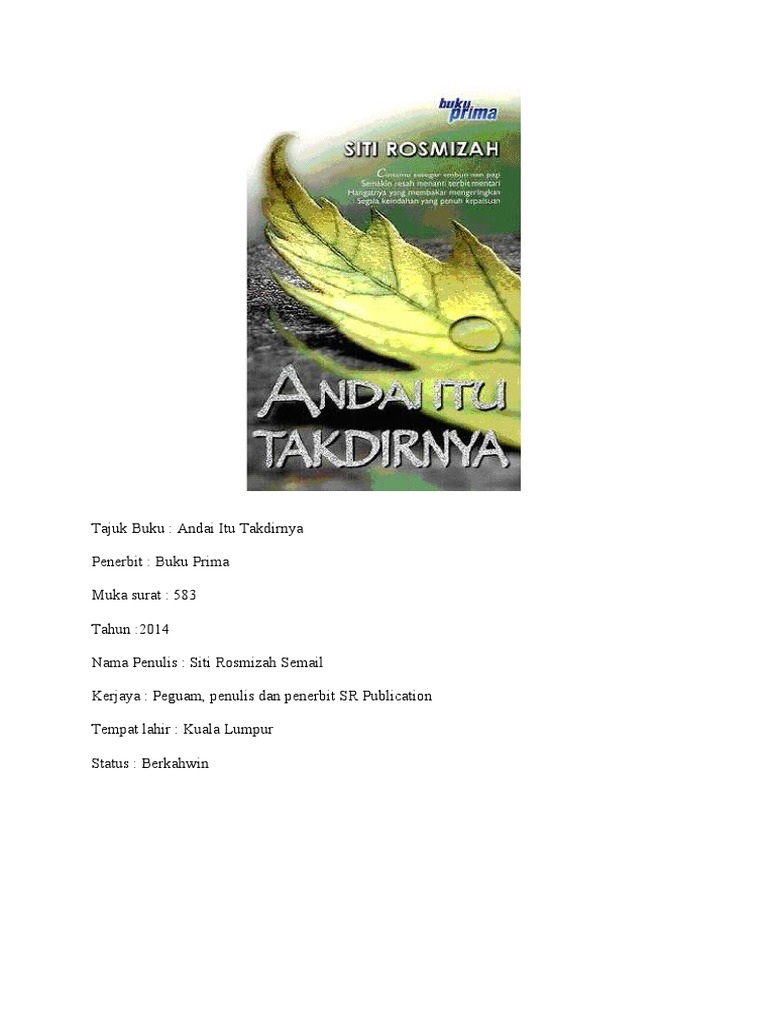 . Read 41 reviews from the worlds largest community for readers. SINOPSIS ANDAI ITU TAKDIRNYA Aleya seorang gadis yang cantik dan berlatarbelakangkan keluarga sederhana dalam diam menyimpan perasaan pada seorang anak tokoh korporat yang ternama yang juga merupakan rakan sekuliahnya di universiti di United Kingdom Syed Adam Aizril. Novel melayu andai itu takdirnya 2 siti rosmizah get great deals on storybooks chat to buy.